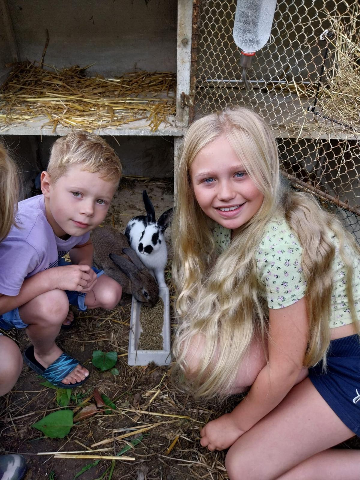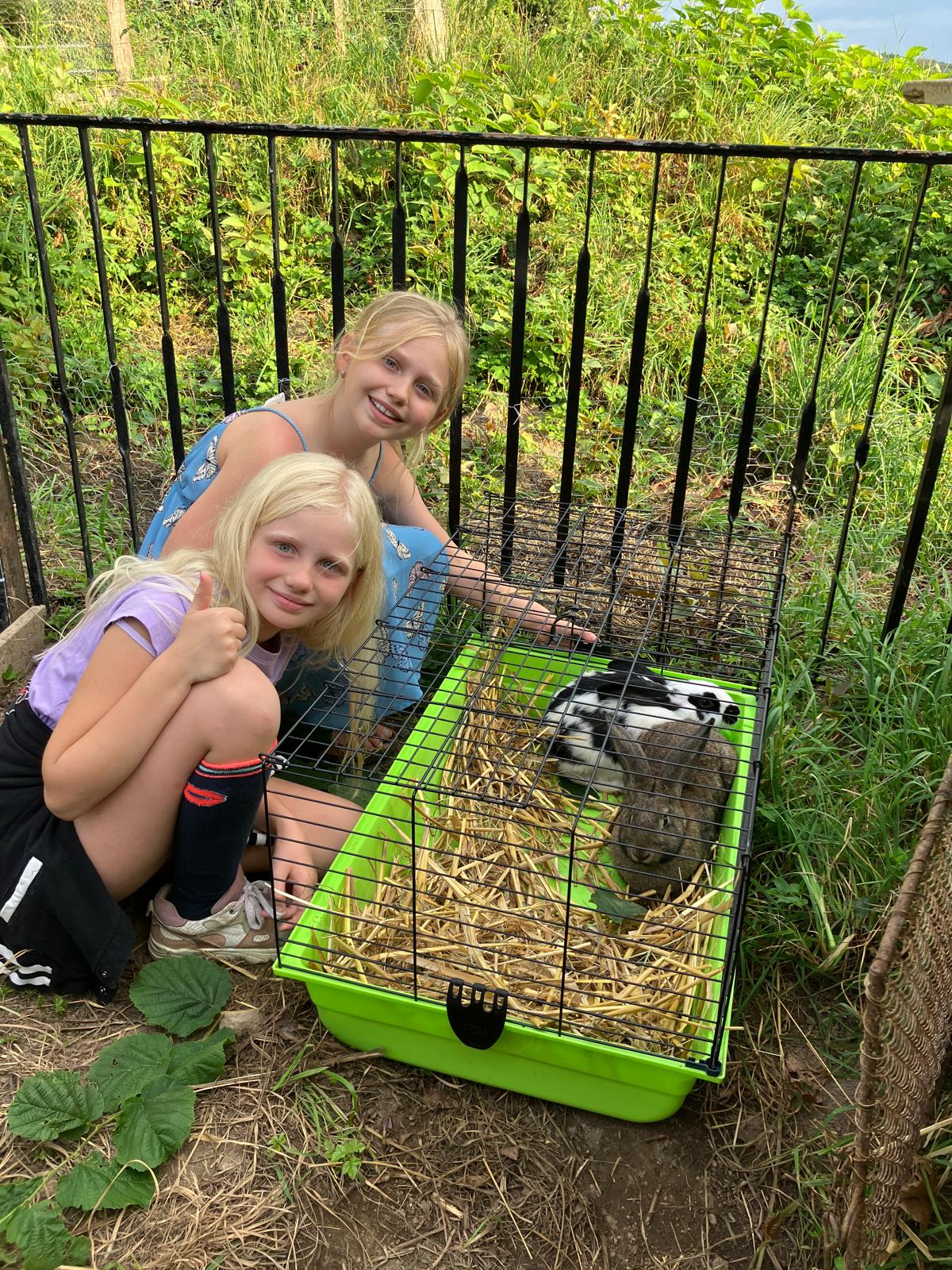 We zijn al een tijd bezig met de konijnen. Het hok was er klaar voor. We hadden een boer gevonden die jonge konijntjes had dus met een dieren- transportbox, gingen we erheen. We zagen diverse nestjes, helaas waren ze nog te jong. Ze mogen pas met 4 maanden weg, dus we moeten nog geduld hebben. De kinderen waren erg teleurgesteld, maar helaas pindakaas. We mochten ze een paar weken later halen, helaas was de boer aan het oogsten, dus nog even wachten. Maar toen op 14 augustus kregen we een telefoontje dat we de konijnen mochten ophalen! Het konijn van Tessa heeft Roxy en het konijn van Iris heeft Louisa.
