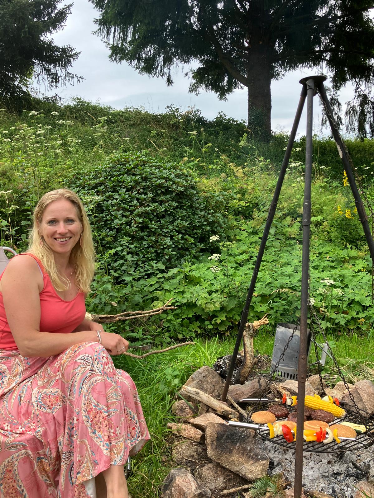 Deze driepoot is heel handig; je kan de hoogte makkelijk verstellen. Heerlijk buiten koken en eten.