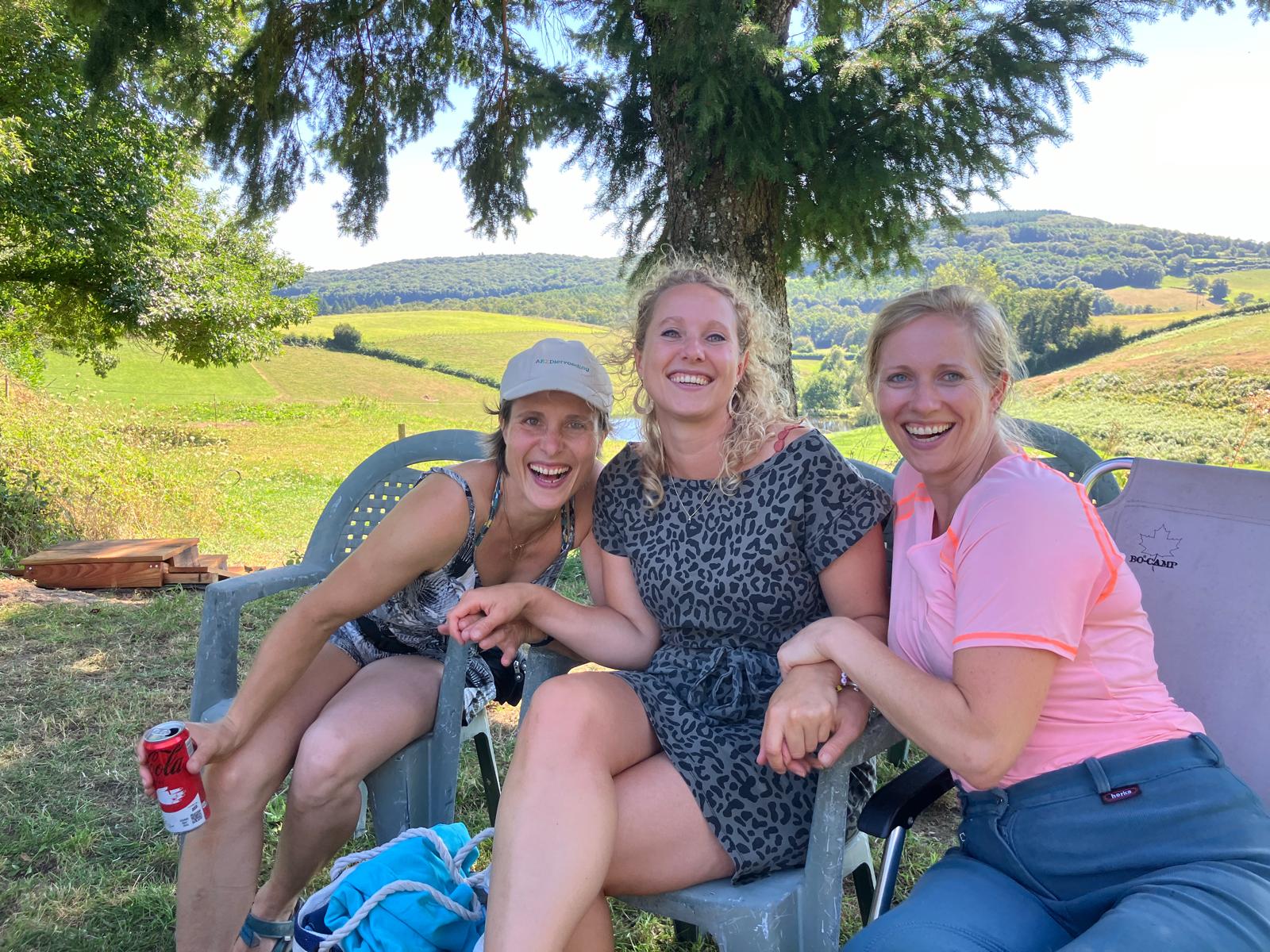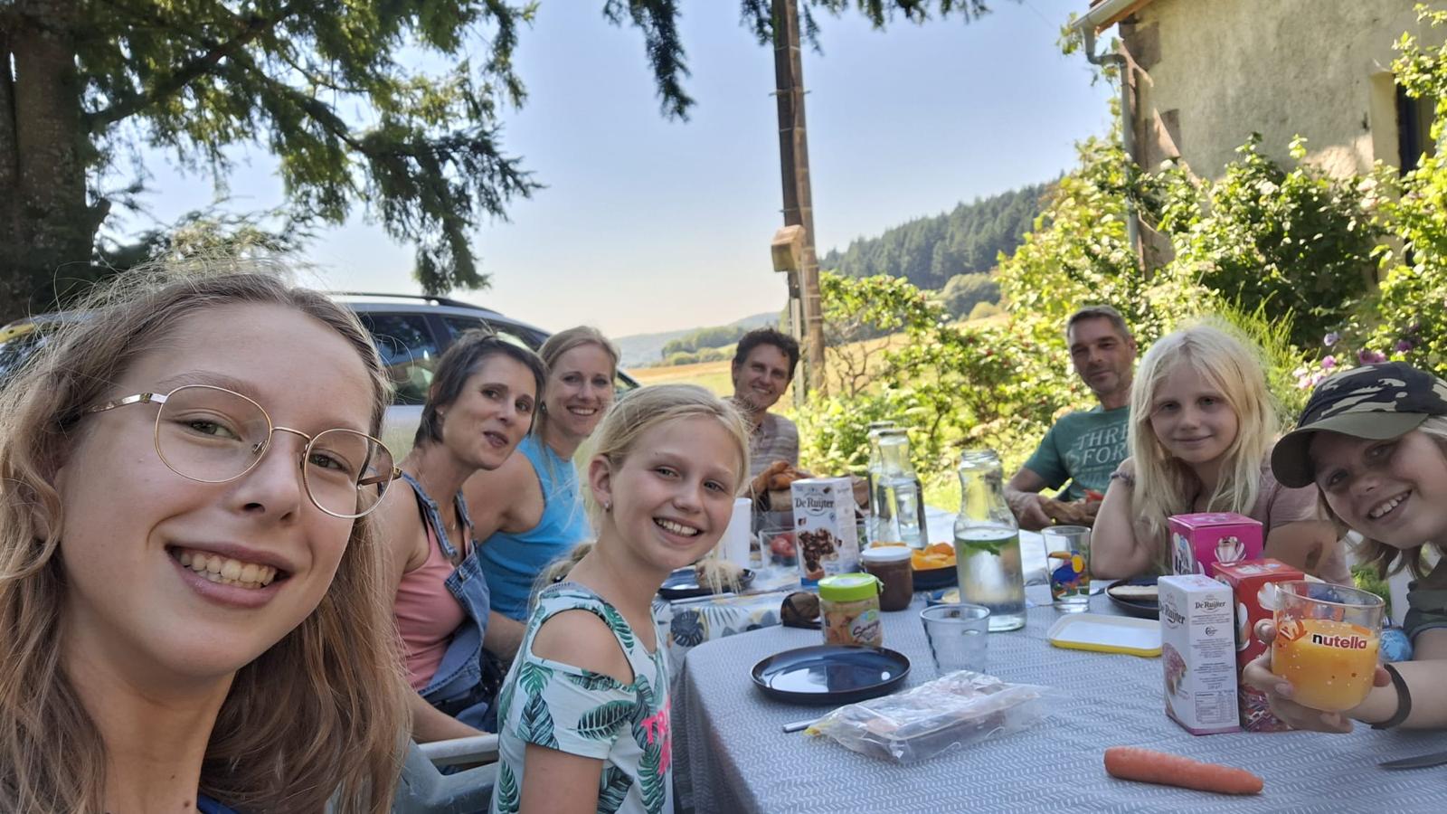 Met zijn allen lekker buiten aan het ontbijt! En ik ga natuurlijk naast me zus zitten! Lekkere franse worst, stokbrood en croissantjes, met heerlijke Nederlandse hagelslag en muisjes. Het beste van twee werelden. Na het ontbijt gaan we paardrijden! We hadden al wel in de bak gereden. Maar een langere buitenrit hadden we nog niet gemaakt. Mijn zus en Julia hebben ook veel ervaring met paardrijden dus fijn om op deze manier te kijken hoe de paarden reageren. Ze zijn super braaf en het gaat goed. Het is erg leuk. ’s Middags gaan we lekker zwemmen, want je krijgt het er wel warm van.
