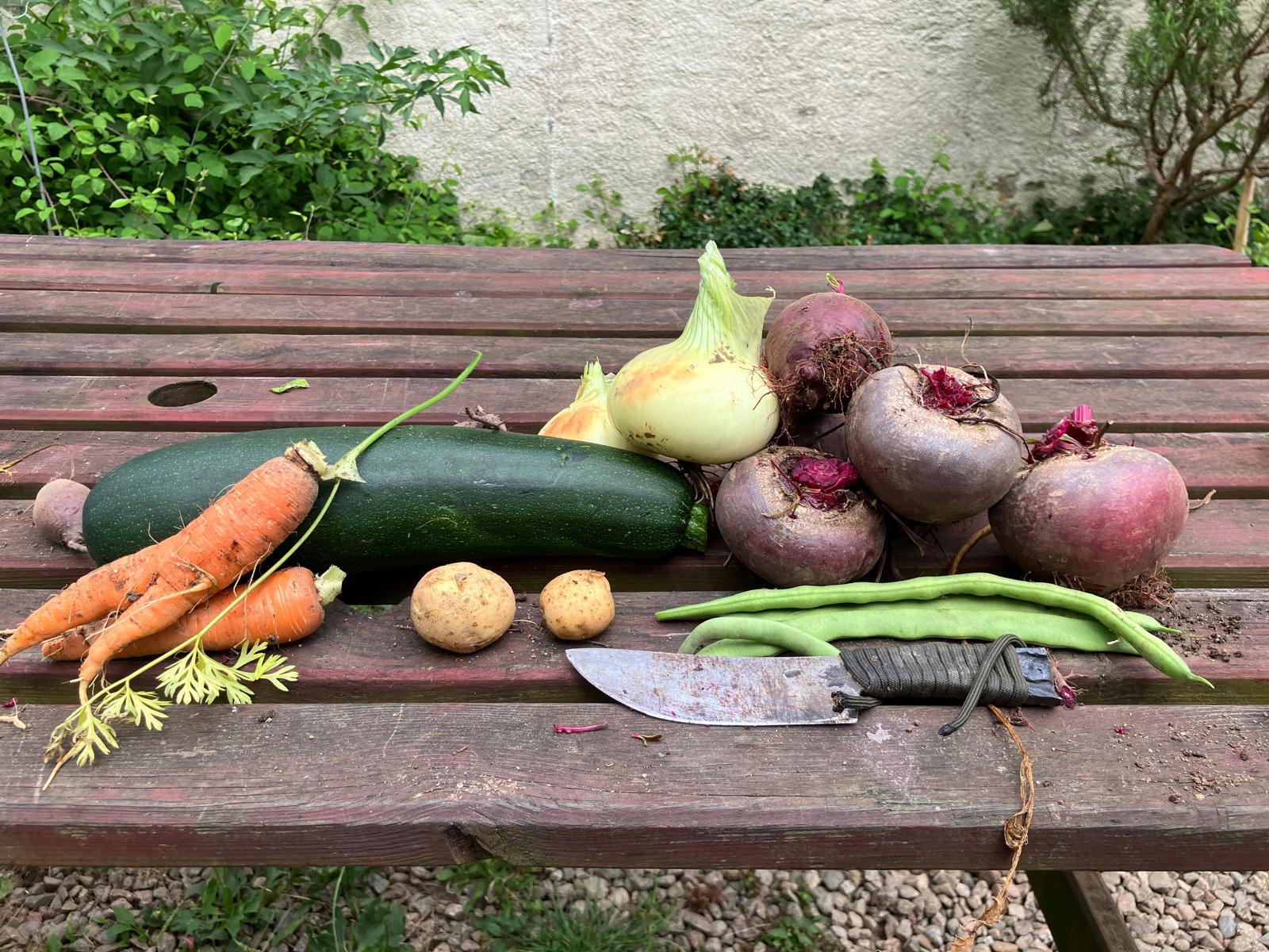 De oogst voor vandaag; Dennis is druk met de groentetuin. Dit mes heeft hij zelf gesmeed, hij is daar heel trots op. En met dit mes snijdt hij alle groentes. Wat gaan we eten? Rode bieten met gebakken uien, de wortelen gaan door de salade. De courgette bewaar ik voor morgen; lekker op het vuurtje, gebakken courgette, bij een broodje hamburger. Je moet er van houden, maar ik ben er dol op.