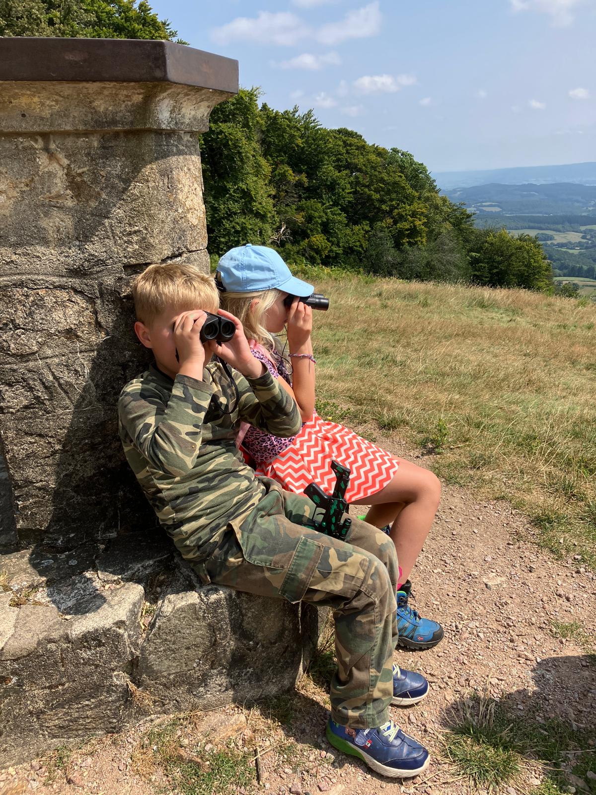 Thijs en Iris kijken door de verrekijker, er is zoveel te zien.