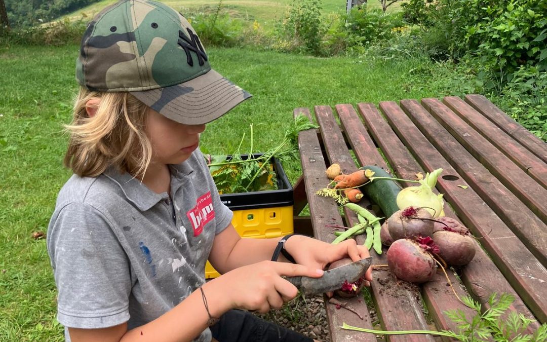 De oogst voor vandaag; Dennis is druk met de groentetuin. Dit mes heeft hij zelf gesmeed, hij is daar heel trots op. En met dit mes snijdt hij alle groentes. Wat gaan we eten? Rode bieten met gebakken uien, de wortelen gaan door de salade. De courgette bewaar ik voor morgen; lekker op het vuurtje, gebakken courgette, bij een broodje hamburger. Je moet er van houden, maar ik ben er dol op.