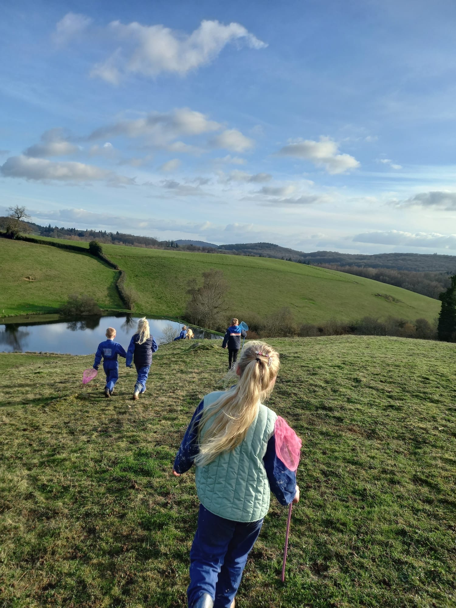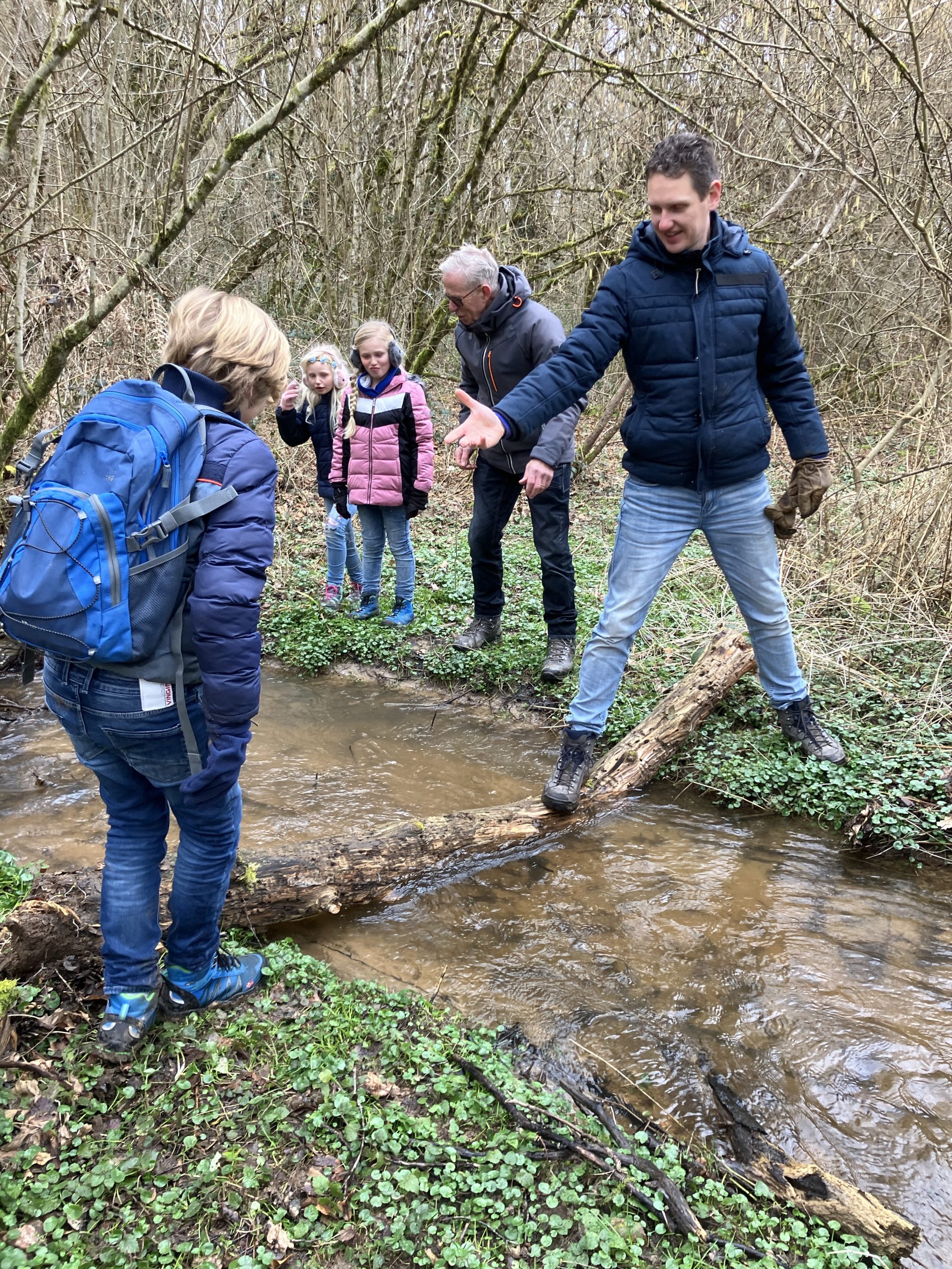 En dan hebben we ook nog een hele leuke wandeling met veel, beekjes en waterstroompjes onderweg. Zo leuk hoe het water hier zijn weg vindt en een kronkelend riviertje wordt. Onze buurman is een paar dagen weg en wij mogen voor de hond zorgen. Dat vinden de kinderen wel erg leuk! Dus de hond gaat ook mee met wandelen. Daarna weer lekker in zijn eigen mandje. De andere dieren krijgen natuurlijk ook hun voer, we verdelen de taken eerlijk want iedereen wil helpen.