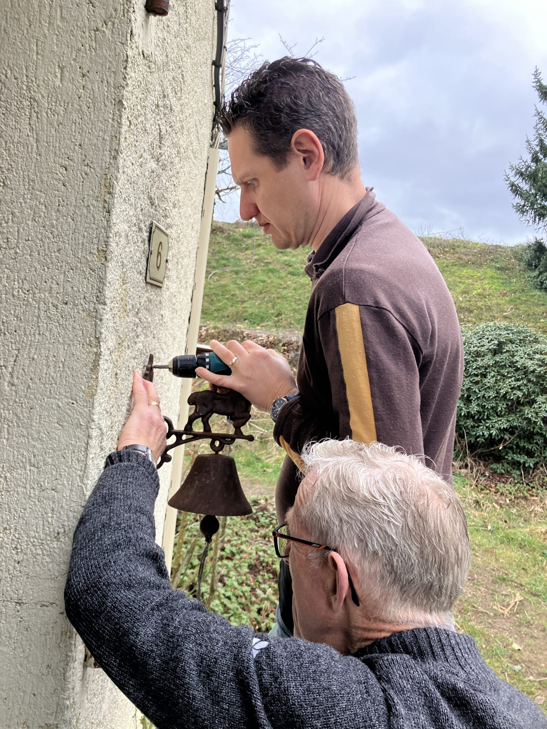 Jeroen is ondertussen met mijn vader de bel aan het ophangen. Een leuk detail; hij hing vroeger bij het huis waar ik ben geboren, in Achterveld. Al die jaren heb ik hem bewaard en nu komt hij hier perfect van pas. Als je de bel hoort, moet je binnen komen, dan is het eten! Maar mocht je in de buurt zijn dan mag je natuurlijk ook bellen om je bezoek aan te kondigen. Verder hangen de schilderijen en lijsten in de woonkamer op hun plek, dat ziet er ook heel gezellig uit. En er hangt ook weer een klok, zo kunnen we weer zien hoe laat het is. Dat werd hoog tijd ;-).