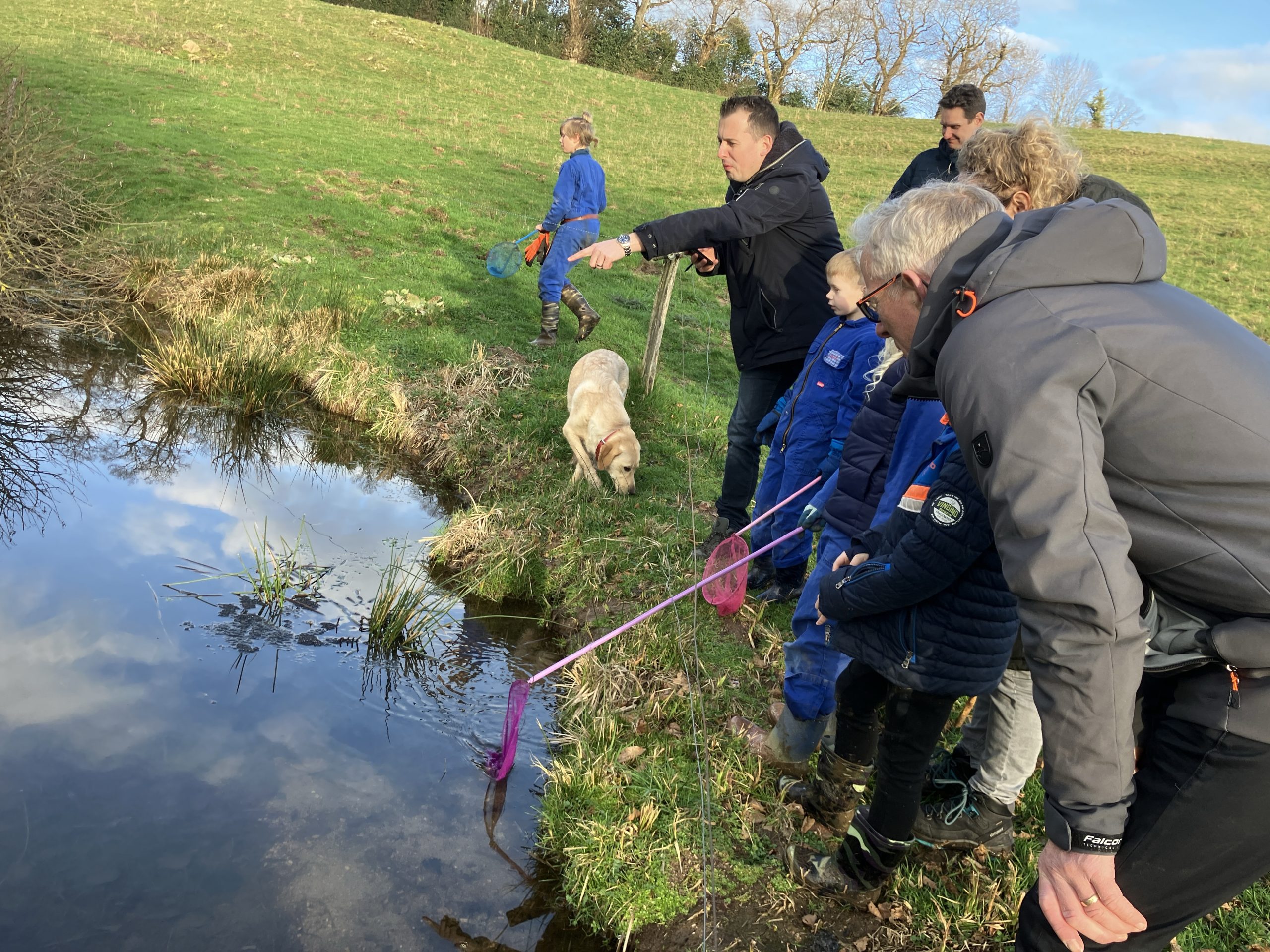 Dat is gezellig, de hele dag is er al een actieve sfeer, het was gelijk een goede reden om boven weer alle kamers te stofzuigen en netjes te maken want er moeten een paar matrassen bij. Wie slaapt waar? Wie gaat bij wie? Uiteindelijk krijgt Tessa een logee(Rik), gaat Iris met neefje Thijs bij Dennis op de kamer, en uiteindelijk wisselen ze de tweede nacht nog om. Zo is het toch eerlijk verdeeld!? Voor dat ze naar bed moeten gaan we eerst nog naar buiten! Het was gelukkig mooi weer. Rik is dol op kikkers en salamanders dus die willen ze eerst zien. Bij het meer ontdekken we dat er al enorm veel kikkerdril te vinden is. We zien ook veel kikkers dus dat belooft wat als alle dikkopjes hier straks rond zwemmen.