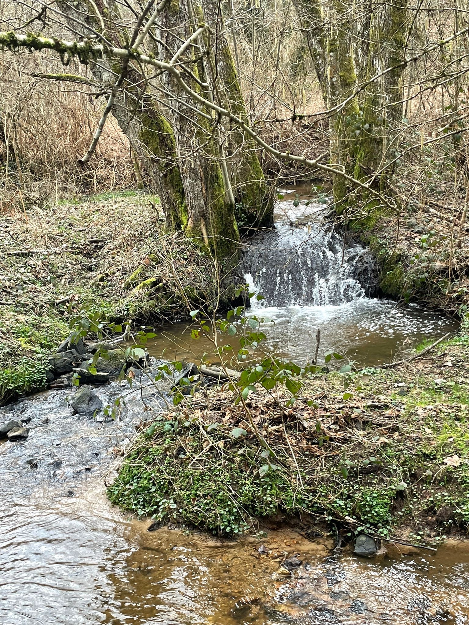 En dan hebben we ook nog een hele leuke wandeling met veel, beekjes en waterstroompjes onderweg. Zo leuk hoe het water hier zijn weg vindt en een kronkelend riviertje wordt. Onze buurman is een paar dagen weg en wij mogen voor de hond zorgen. Dat vinden de kinderen wel erg leuk! Dus de hond gaat ook mee met wandelen. Daarna weer lekker in zijn eigen mandje. De andere dieren krijgen natuurlijk ook hun voer, we verdelen de taken eerlijk want iedereen wil helpen.