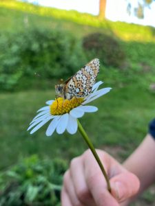 Iris heeft deze prachtige vlinger op het bloemetje gevonden. Ze heeft het bloemetje geplukt terwijl de vlinder gewoon bleef zitten. Dat was speciaal, daar hebben we gelijk een foto van gemaakt.