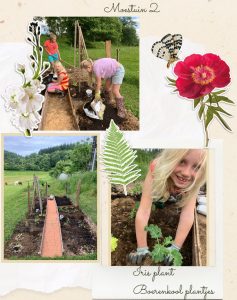 We hadden in bakjes al veel groentes voorgezaaid binnen. Het kwam goed op, dus we kregen in onze eerste groentetuin wel wat ruimtegebrek. Nu hebben we plek genoeg, dus zo ontstond het plan om groentetuin 2 te maken. Deze is wat groter geworden. Jeroen heeft het gras er in dikke plaggen afgestoken zodat we dit nog bij de waslijn kunnen gebruiken. Daar was de grond meer met stenen bedekt en er groeide alleen maar onkruid. Het zaaien van graszaden had geen effect, maar de grasplaggen slaan wel aan! Dus heel fijn om nu op het gras te kunnen staan wanneer ik de was op hang. Iedere keer kijk ik dan starend vooruit en geniet ik van het uitzicht. Wat is het toch een leuk plekje. Daarna heeft Jeroen palen in de grond geslagen en er gaas omheen geplaatst. De kippen scharrelen hier vrij rond en er zijn ook andere dieren die anders van de groenten komen snoepen. Toen zijn er nog houten planken gezaagd om zo een afscheiding te kunnen maken in de groentetuin. In het middenpad hebben we zaagsel gestrooid; zo ideaal! De kleigrond plakt anders enorm aan je laarzen en de eerste meters krijg je zo’n modderspoor. Nu heb je daar geen last van!