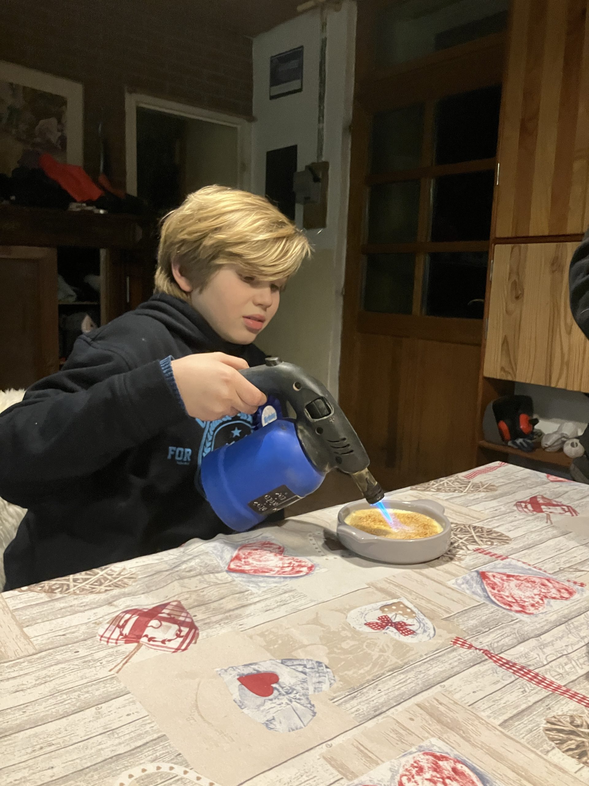 Het feestmaal voor die avond was zorgvuldig geselecteerd; Broccoli, kipkluifjes en krieltjes. Onze buurman vroeg aan Dennis of hij niet liever frietjes wilde eten op zijn verjaardag. Dennis zei; “ja, natuurlijk, maar waar haal ik die vandaan?” Lambert vertelde dat je op nummer 3 friet kan krijgen en dat wordt ook nog bezorgd! Nou dat was dus geregeld. Friet eten op je verjaardag, check! Als toetje trakteerde Lambert ons op Crème Brûlée. Ze mochten ieder het laagje suiker branden op hun eigen toetje, dat maakte het feest compleet!