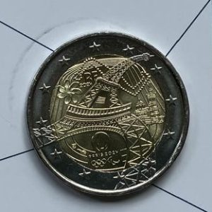 Dennis en Tessa hadden ook een envelop gekregen. Thuis maakte ik hem aan tafel open; er zat een boekje in over de Olympische spelen. Dit jaar worden in Frankrijk de olympische spelen gehouden, dus daarom een boekje met uitleg welke sporten er zijn en in welke landen het georganiseerd is en nog veel meer. Er zat ook een spelletjes boekje bij waarin je een doolhof of een puzzel kon maken, maar het allerleukste zat achterop. Het is een 2 euromunt!! Een echte. Wat denk je dat er op de munt te zien is?