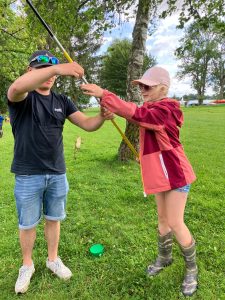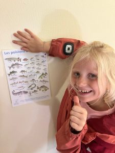 Daarna gingen we Vissen. De meneer die het begeleidde, liet de kinderen eerst met een hengel met een gewichtje er aan oefenen. Bij welk pionnetje komt je gewichtje uit? Hoe werp je ? Heel interessant om te zien. Daarna kregen de kinderen allemaal een eigen vishengel met aas er aan en werd er gevist. Iris had 3 keer een vis gevangen! Wat een geluk. Een Poisson chat, heette de vis. Na afloop kregen we een kaart met alle vissen te zien die hier veel gevangen worden. Hartstikke leuk.