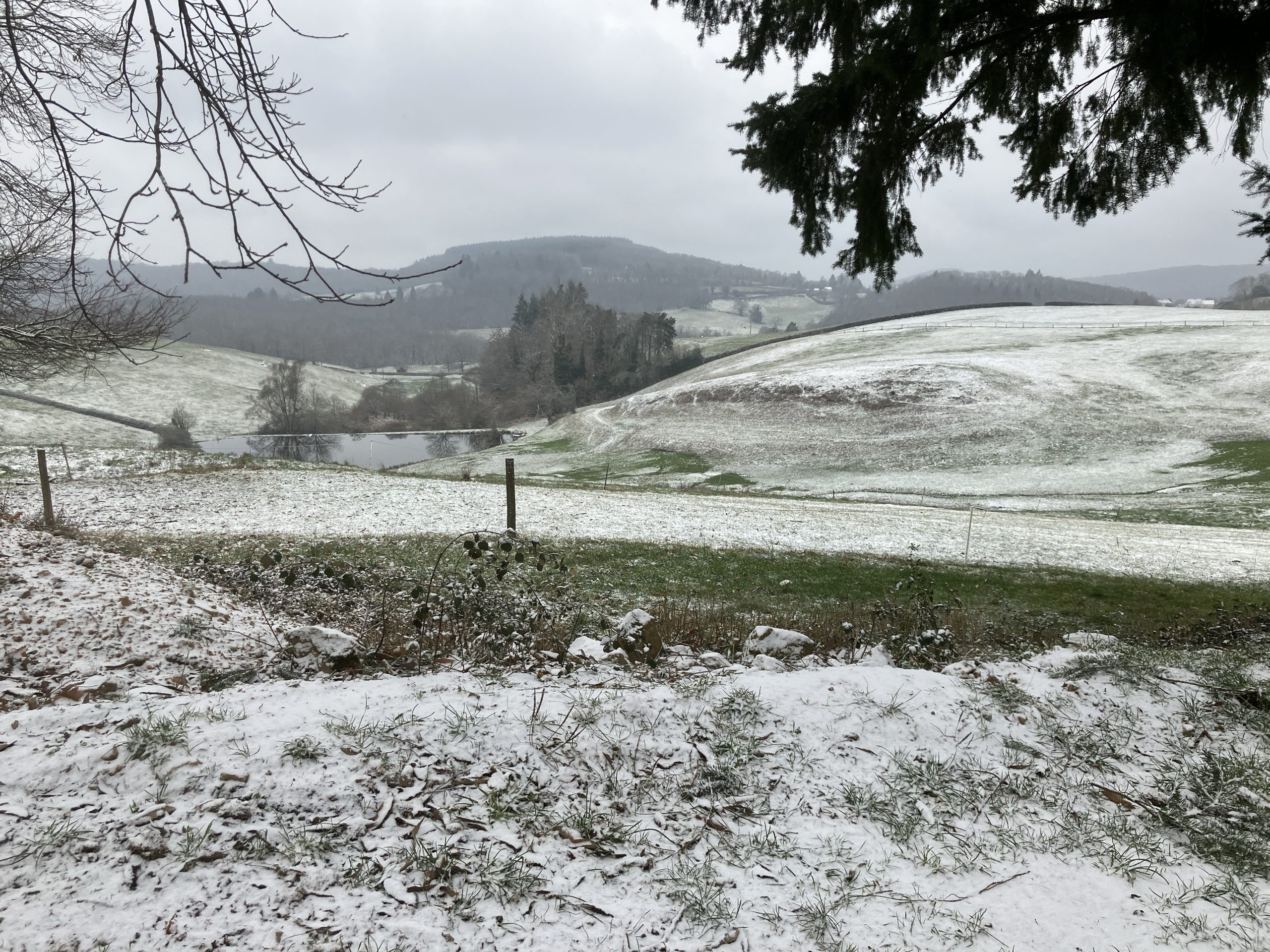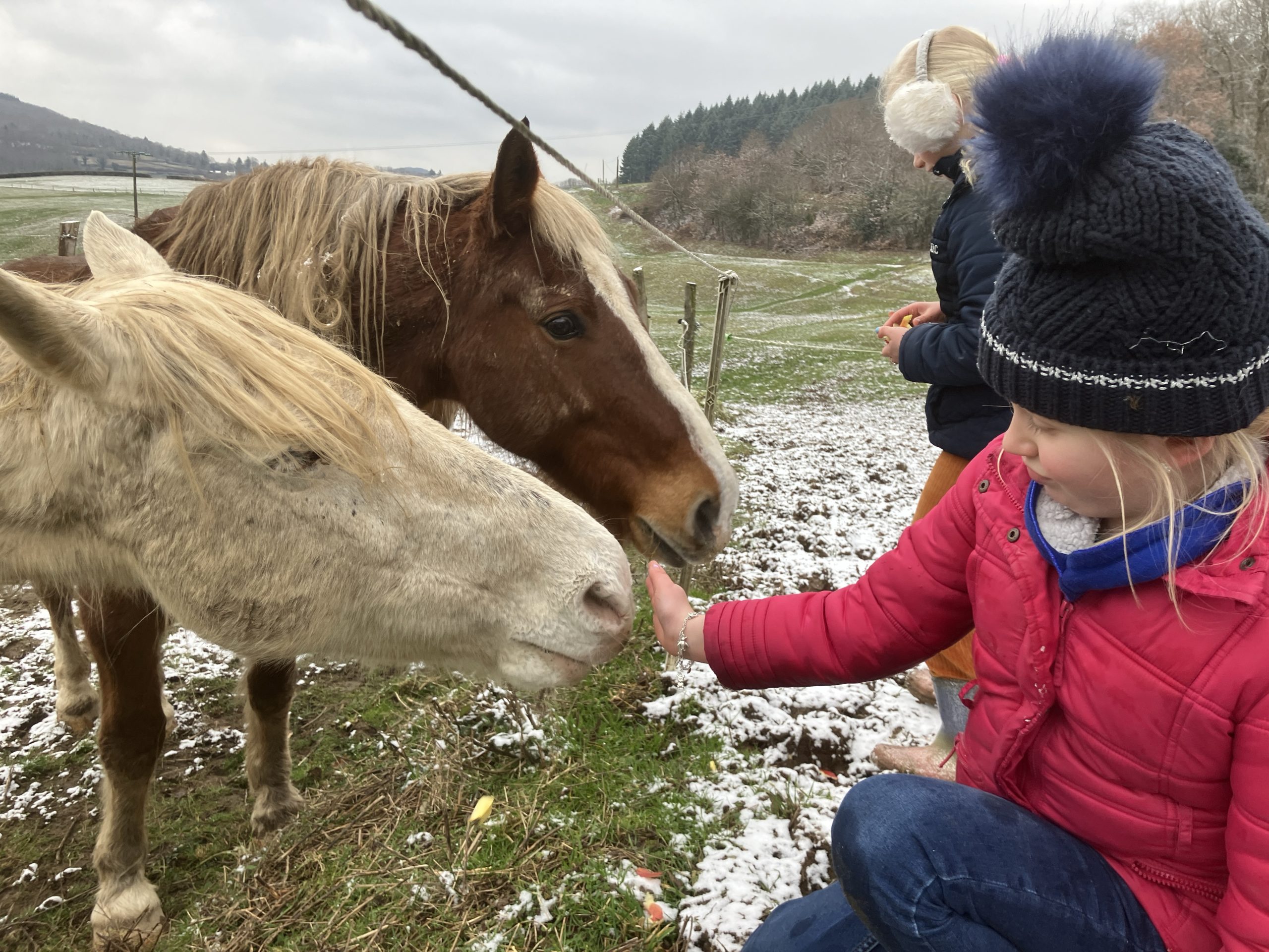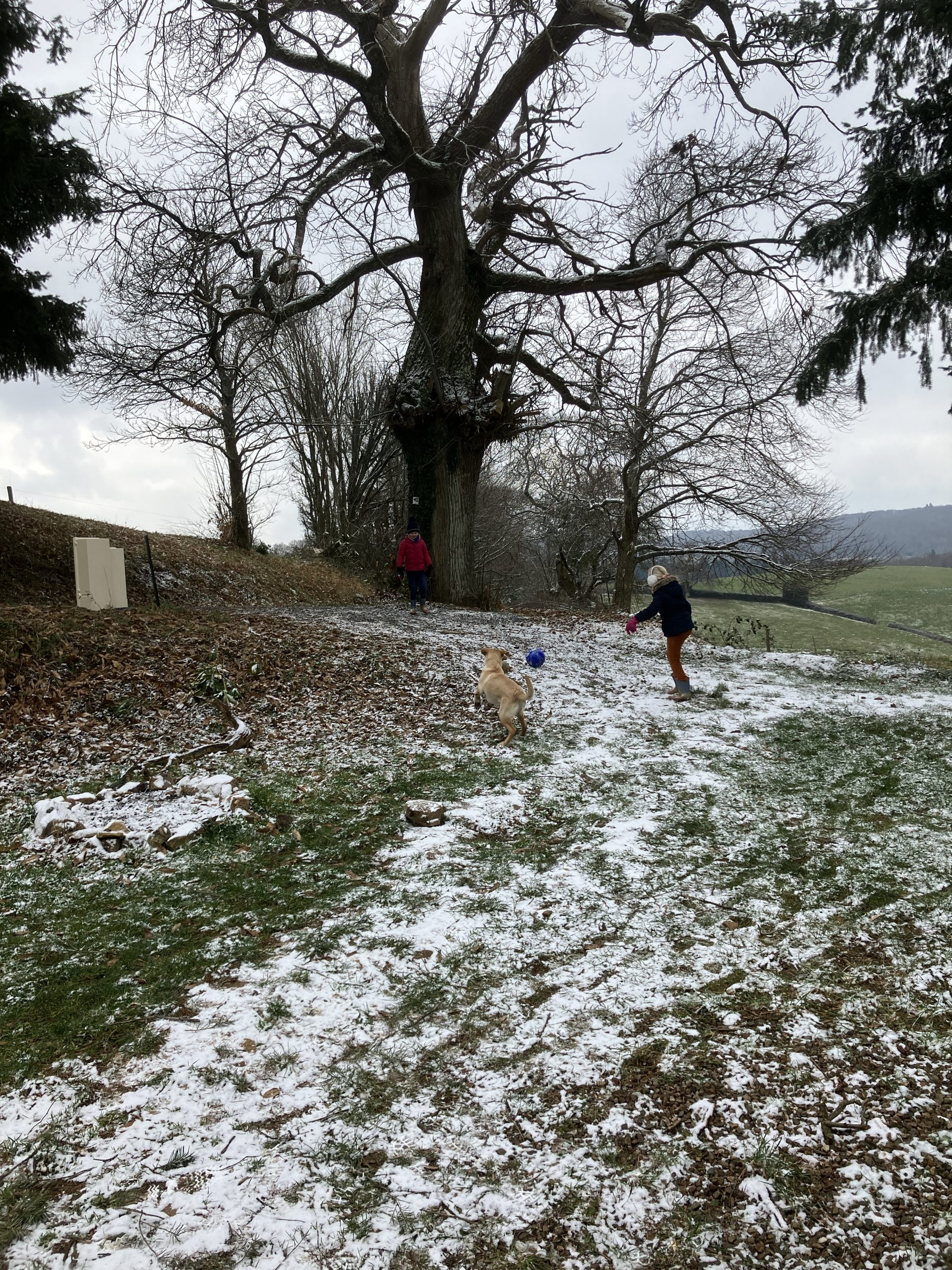 Vanochtend werden we wakker met een beetje sneeuw op het raam! Na het ontbijt vond Louis, de hond het te lang duren, terwijl hij net zulke leuke vriendjes had gekregen! Dus zo stond hij bij ons voor de deur! Je begrijpt het al… De kinderen willen meteen hun jassen aan en naar buiten!