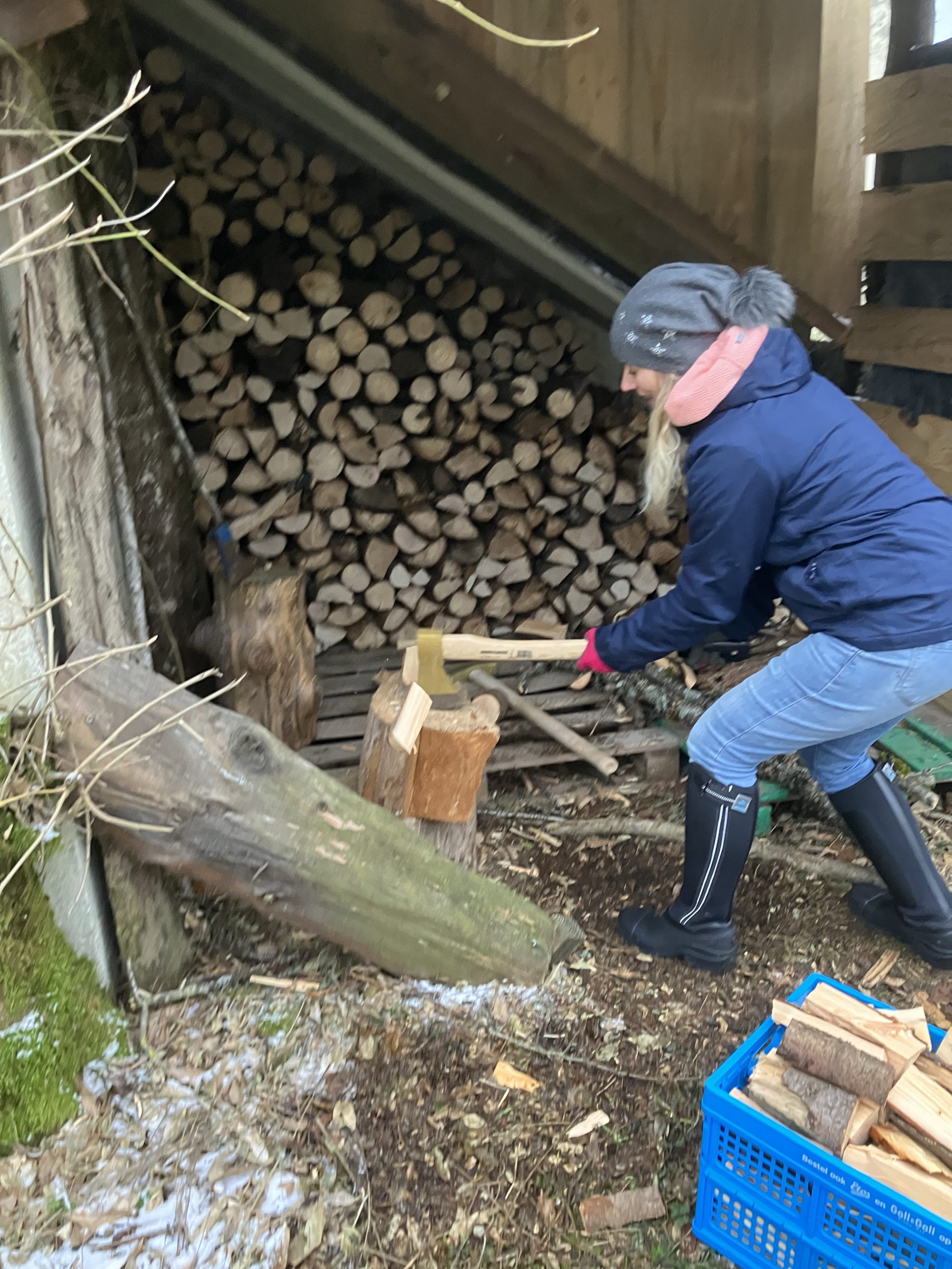 Ik was vanmiddag nog even de keuken in orde aan het maken, de kinderen waren al weer naar buiten gegaan toen ik getoeter hoorde. Even uit het raam kijken… En ja hoor ze mochten alweer mee op de trekker. Hout halen en laden. En later nog naar een andere plek waar droger hout lag, dat wordt mooi aanmaakhout, dus Dennis ging meteen aan de slag met kloven. De stukjes moeten nog wel wat kleiner dus morgen zijn we hier ook nog wel zoet mee. En ja, ik help ook met kloven! Echt leuk als het houtje in stukken splijt.