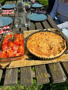 Mijn vader en moeder zijn aan het fietsen in Frankrijk en komen daarna weer bij ons uit. Hoe leuk is het als oma je dan van school komt halen! We hebben heel wat te vertellen. En Opa en Oma ook! We kijken naar de foto’s. We doen veel leuke dingen met elkaar. We hebben zelfs een wandeling gemaakt met elkaar, toen de kinderen op school zaten. En zoals de fransen het doen; een warme lunch. Een Quiche met daarnaast Tomaten uit eigen tuin! De Tomaten had ik in partjes gesneden en in een ovenschaal gedaan. Wat olijfolie, zout en peper, een klein beetje geraspte kaas en verse roosmarijn, Hij kon zo naast de Quiche in de oven, ideaal. De Quiche is ook makkelijk te maken en na de wandeling hadden we wel trek gekregen. Heerlijk in het zonnetje lunchen.