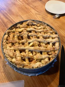 De eerste appels vallen van de bomen. Opa is een kampioen in appels schillen. Hij schilt de appels dun en lekker snel, dus we eten appelmoes en appeltaart. Iris helpt ook graag met bakken. Ze vindt het heel leuk om het deeg te kneden. Ze wilde het graag met de hand doen. Halverwege hebben we toch de mixer er even bijgepakt, want het is wel zwaar werk voordat je alle boter door het meel hebt gekneed en het een mooie deegbal is geworden.