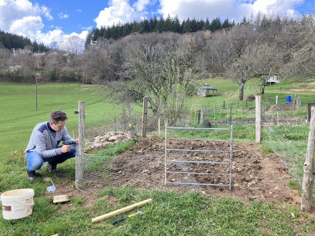 De moestuin is klaar! Dat is fijn dan kunnen de zaden de grond in. De grond is omgespit en er zijn veel stenen uit verwijderd. De grond is bemest en wat vlakker gemaakt, we blijven nog steeds stenen vinden. Dennis vond ook veel ijzeren voorwerpen, dus het was een soort schat zoeken ;-). In het bericht naar school, zie je een foto staan van het begin. Er lag op de plek ook nog een laag kleigrond, deze is verplaatst, zo kunnen we hier nog klei van maken. Dit was wel extra werk. Jeroen heeft er ook gaas omheen geplaatst en een mooi hek ervoor gemaakt. Er zijn hier herten die graag van de oogst komen knabbelen, ook de kippen pikken een graantje mee. De Erwten, worteltjes, rode bieten en uien hebben we inmiddels gezaaid. We hadden in de winkel alvast slaplantjes gekocht. Ik ga ze binnen ook voorzaaien, maar dat duurt nog even, hopelijk worden dat ook nog mooie plantjes. We kunnen vanuit de woonkamer een plek aan de rand van bomen vaak een groepje hertjes zien! Dat is zo leuk! We hebben de verrekijkers nu standaard klaar liggen, want die hebben we wel nodig.