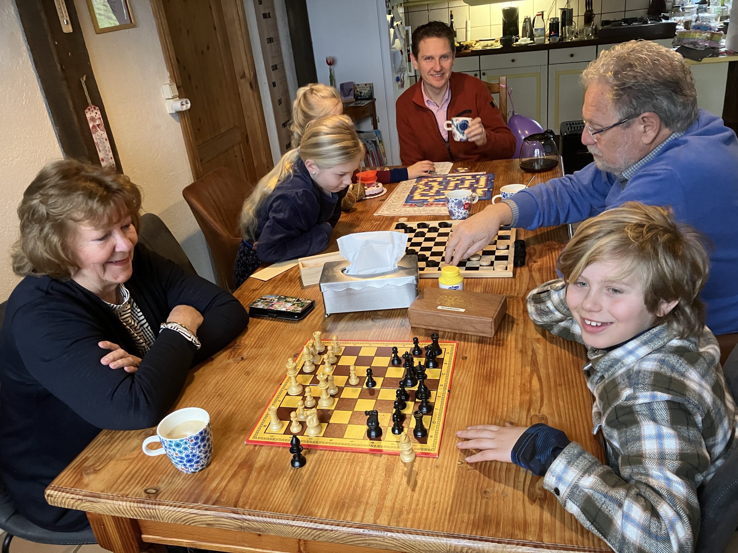 Er zat nog wat regen in de lucht en dat viel allemaal naar beneden. Tijd om binnen te blijven. Dennis pakte meteen het schaak- en dambord erbij en er werden gezellig spelletjes gespeeld. Oma is stiekem heel goed in schaken. We hoorden hoe ze dat geleerd heeft en gelukkig wilde oma alle geheimpjes verklappen aan Dennis. Dus pas maar op als je eens met Dennis gaat schaken!! Tessa had met skivakantie leren dammen van Opa Blom en nu opa Waldhober er was kon de damles worden voortgezet. Iris vindt Doolhof een heel leuk spel, dat speelde zij met ons. We zijn de hele ochtend zoet geweest want daarna wilden de kinderen ook nog wisselen.
