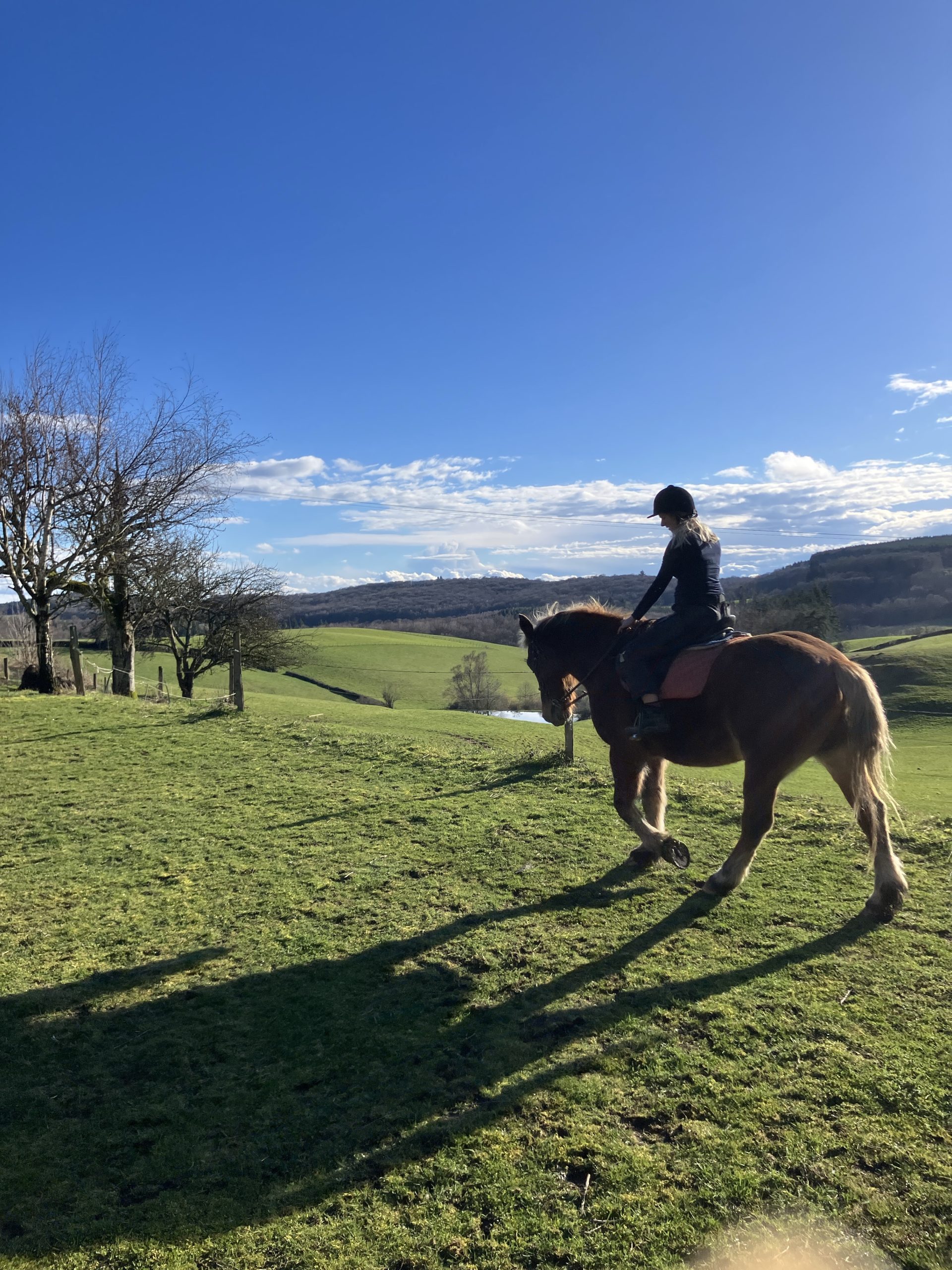 Het weer klaarde niet een beetje op, het werd gewoon super zonnig weer, echt heerlijk! Na al het poetsen van de paarden vonden we het tijd om eens te gaan paardrijden. Wie krijgt de eer om dat uit te proberen? Dat ben ik! Dus eerst nog wat onwennig, maar Spirou is een heel braaf paard en na wat los stappen en draven staan er nog een paar enthousiastelingen te wachten, die willen ook even rijden. Omdebeurt allemaal op Spirou. Spirou vindt het allemaal prima, dus dat is fijn. Nog wel even wennen aan alle fransen namen voor stap, draf en galop. We hebben nu in de bak gereden, maar over een tijdje hopen we ook buitenritten te gaan rijden, nu al zin in.