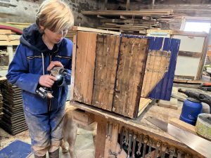 Dennis is vastbesloten om konijnen te gaan houden, hij is erg druk met het konijnenhok. Hij is nu nog bezig met het binnen verblijf en als dat klaar is dan komt er nog een buitenverblijf aan vast. Het leuke is dat hij alles zelf doet! Hier schroeft hij latten op het frame. Hij wil het hok ook nog een leuk kleurtje geven, ik ben benieuwd welke kleur het gaat worden.