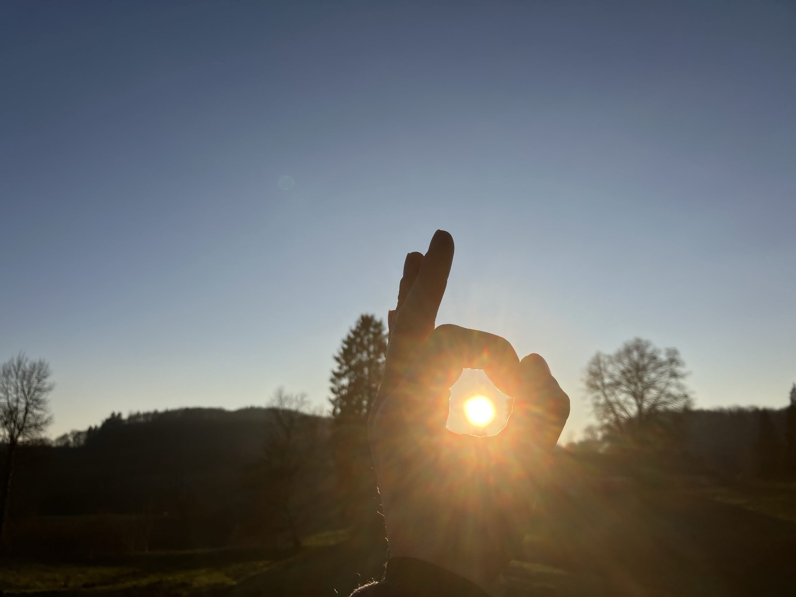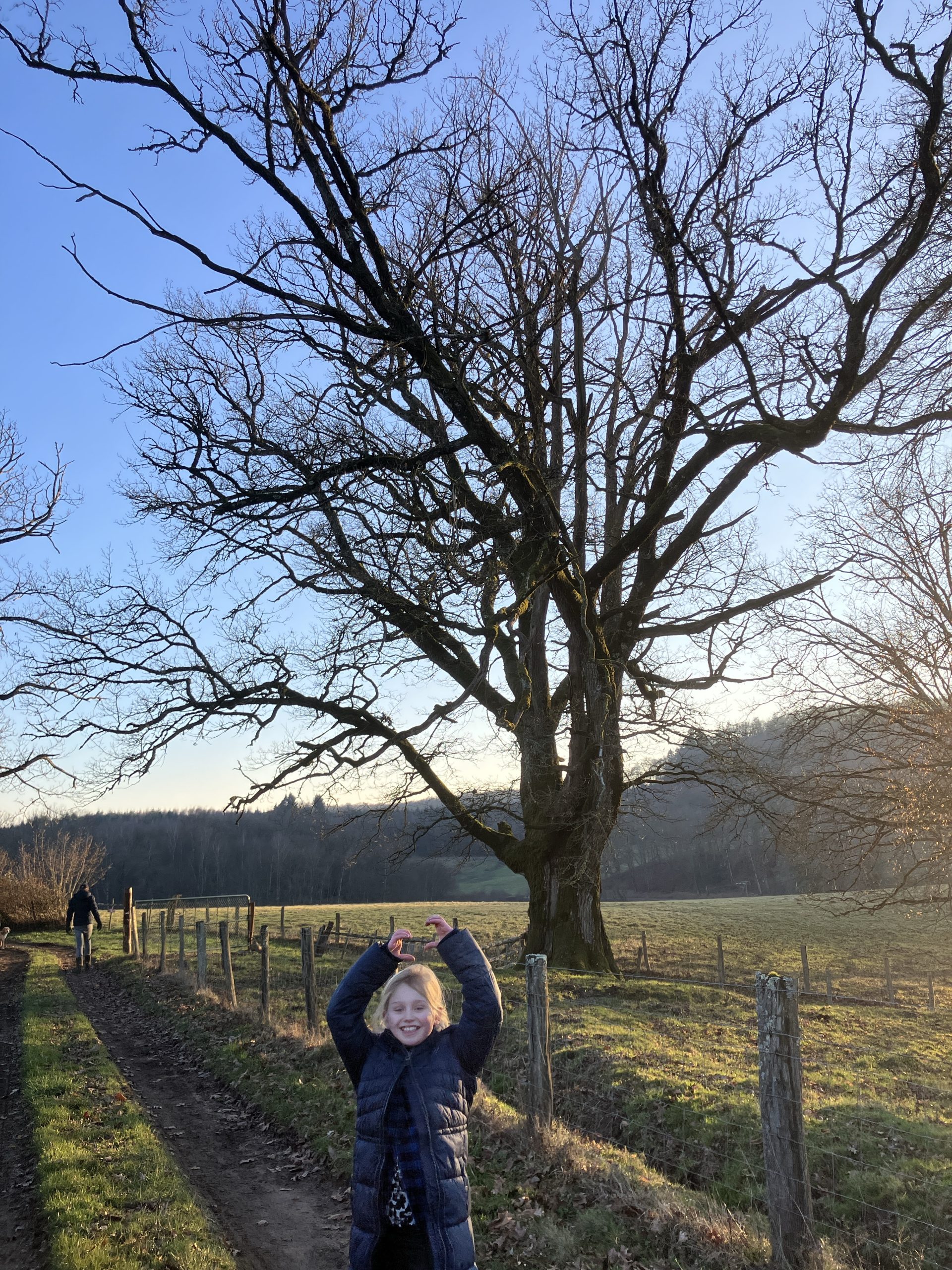 We hebben ook overdag een keer een wandeling gemaakt! Ook leuk om bij daglicht de omgeving te zien. En wat is het mooi. We komen ogen te kort. Lekker diep inademen, deze frisse winterlucht en ook weer uitademen natuurlijk. We genieten ervan. Doordat we door een heuvelachtig landschap liepen leek het of de zon al bijna onderging, en kon ik deze foto maken. Daarna liepen we weer omhoog en bij ons huis, duurde het nog zeker een half uur voor de zon daadwerkelijk onderging.