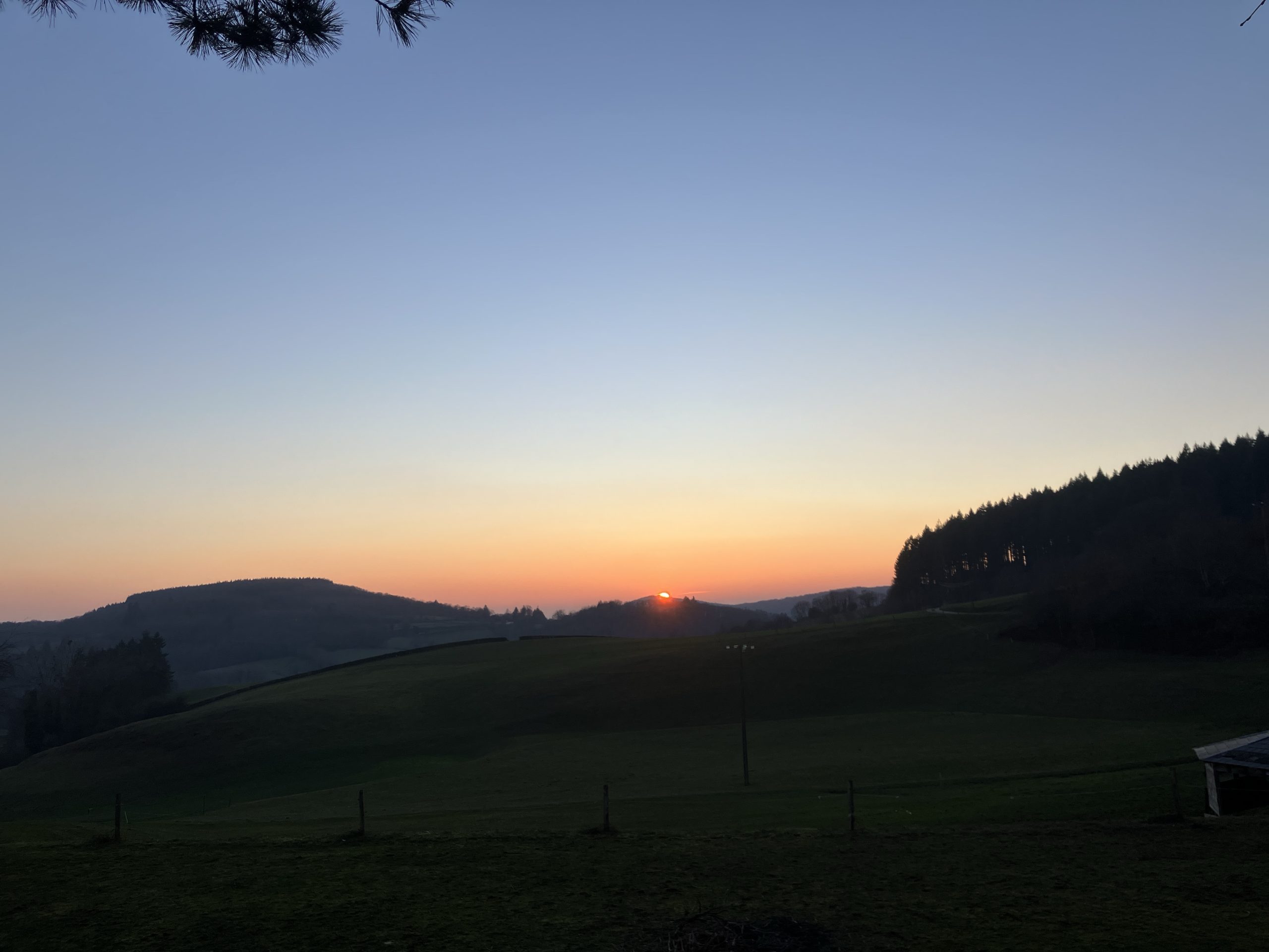 We hebben ook overdag een keer een wandeling gemaakt! Ook leuk om bij daglicht de omgeving te zien. En wat is het mooi. We komen ogen te kort. Lekker diep inademen, deze frisse winterlucht en ook weer uitademen natuurlijk. We genieten ervan. Doordat we door een heuvelachtig landschap liepen leek het of de zon al bijna onderging, en kon ik deze foto maken. Daarna liepen we weer omhoog en bij ons huis, duurde het nog zeker een half uur voor de zon daadwerkelijk onderging.