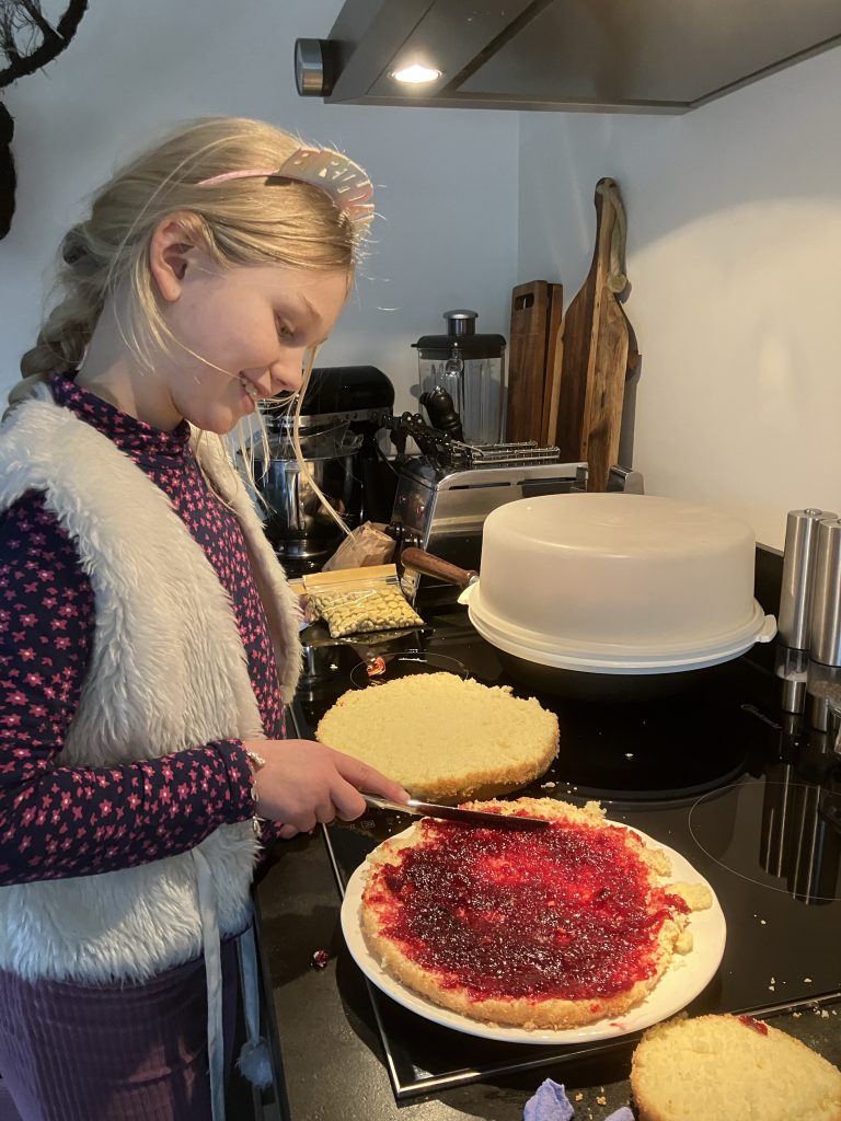 Vrijdag heb ik samen met Tessa haar verjaardagstaart gemaakt. Ieder kind mag als hij (of zij) jarig is een taart kiezen! En Tessa koos voor slagroomtaart. We hadden in Frankrijk ‘het biscuit’ al gebakken, zo hoefden we het alleen met jam en slagroom te decoreren. Zo’n gezellig werkje om samen te doen. Hij was prachtig! En ook super lekker. Hij is inmiddels helemaal op!