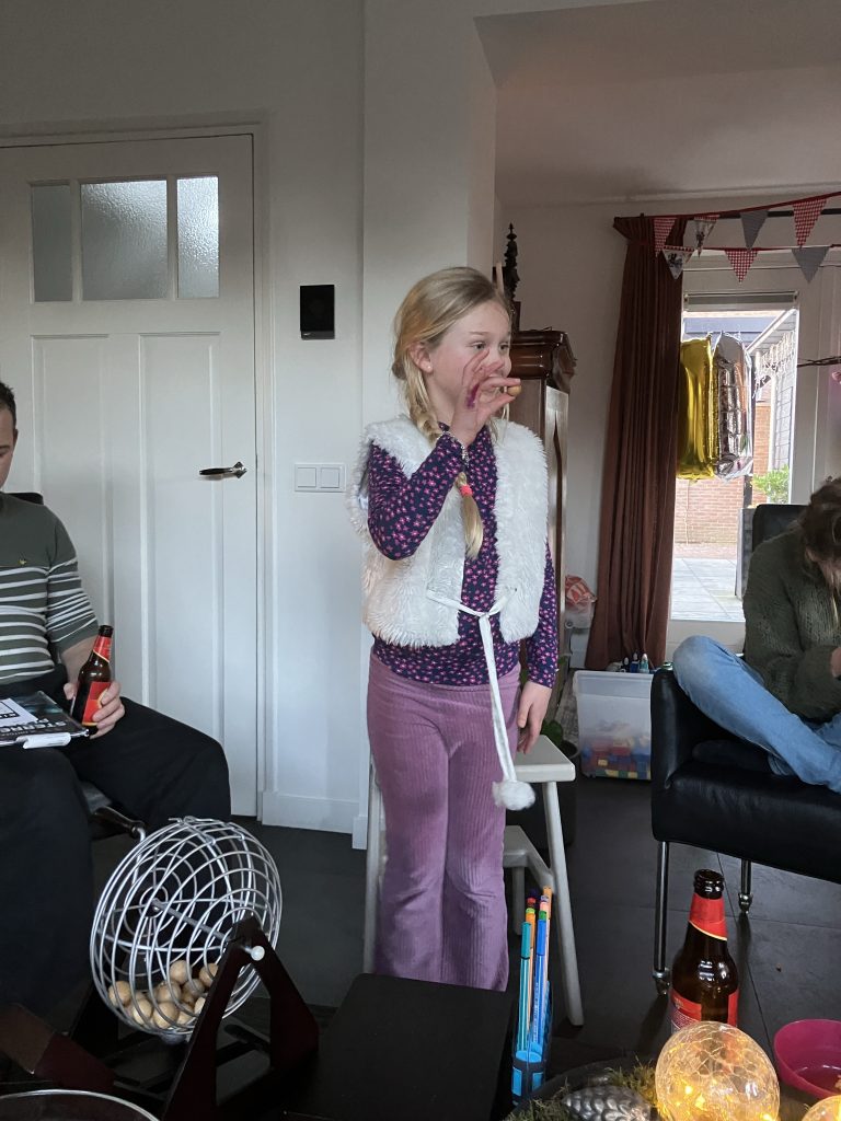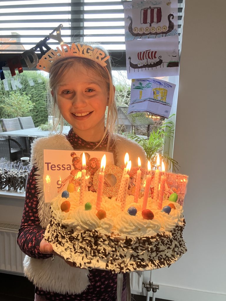 Tessa haar verjaardag begon ook met cadeautjes in het grote bed. We hebben natuurlijk ook voor haar gezongen! De avond ervoor hadden we de slingers al opgehangen en kreeg ze een versierde stoel met stoeltekening. Dat laatste hoort er zeker bij! Ik kreeg nog wat tips ingefluisterd over elfjes en eenhoorns. En ‘s middags kwam de visite! ze heeft zelf een bingo georganiseerd en noemde de getallen in het Frans! Zo leuk, dat ze dat wel even regelt. Ik ben zo trots op haar, ze is nu 9 geworden! Echt een hele grote meid.