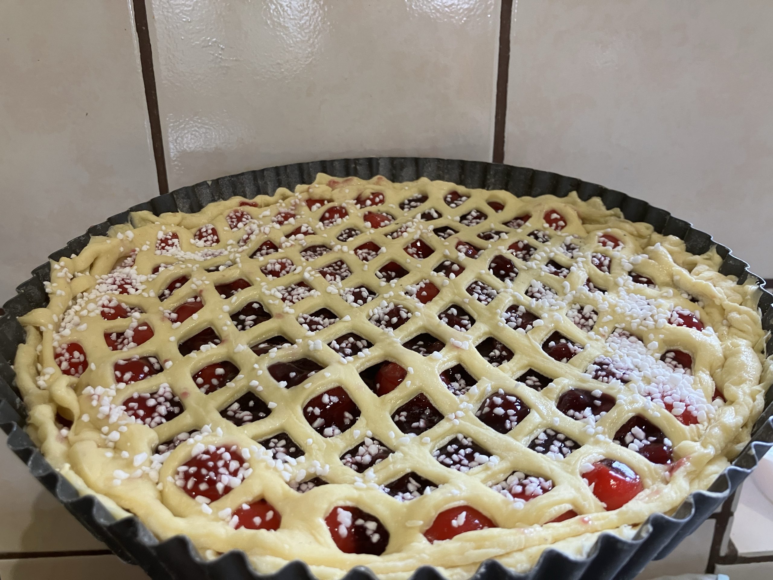 Ondertussen zijn Tessa en Iris weer binnengekomen en zij beginnen te werken aan hun verjaardagstekeningen voor Dennis. Ik zet kindermuziek op en we zingen met zijn allen. Ondertussen verandert de sfeer en zijn we weer vrolijk. Ik kan nog wat liefde en positieve intenties meegeven aan de kersensaus en ook aan het maken van de ruitjes die ik bovenop de kersenvlaai leg. Daar heb ik een mooi raster voor, ik rol het deeg er op uit, tik alle ruitjes er uit, draai daarna het raster om en tadaa… het is ineens een echte vlaai geworden!