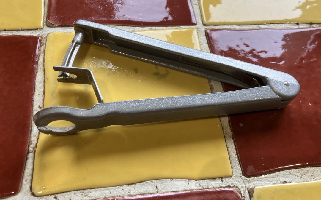 Ik had nog even een tegenvaller bij het maken van de kersenvulling; ik proefde een kers uit de pot met kersen, en je raadt het al.. Er zit een pit in. Ik proef nog een tweede kers, en ja hoor, ook een pit. Dat kan geen toeval zijn, dit is dus een hele pot vol “kersen met pitten”. Ik ga even in mijn keukenspullen kijken want ik moet ergens een kersenontpitter hebben. Gelukkig heb ik hem vrij snel gevonden en heb ik in een handomdraai alle kersen ontdaan van hun pit. Dat viel toch weer mee. Dat ding wat ik als foto heb uitgelicht; is dus mijn kersenontpitter.
