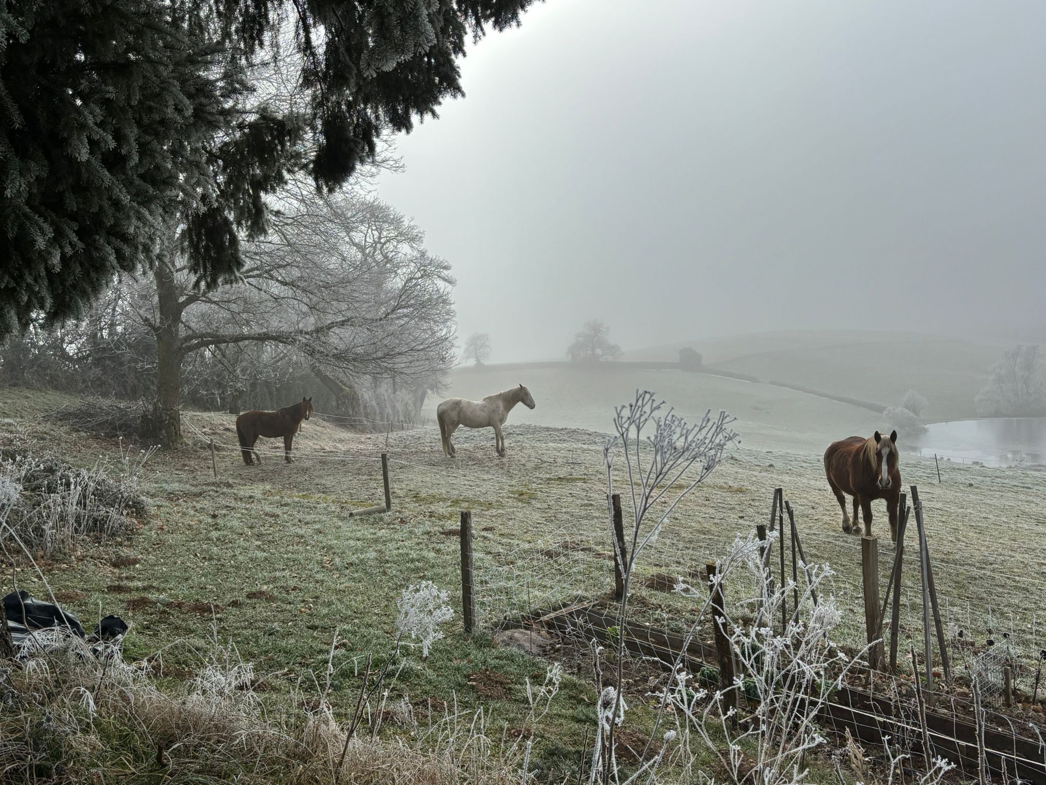 De paarden staan ’s morgens vaak naast ons huis, even gedag zeggen. Tessa werd wakker en zei; het lijkt wel magisch winterwonderland.