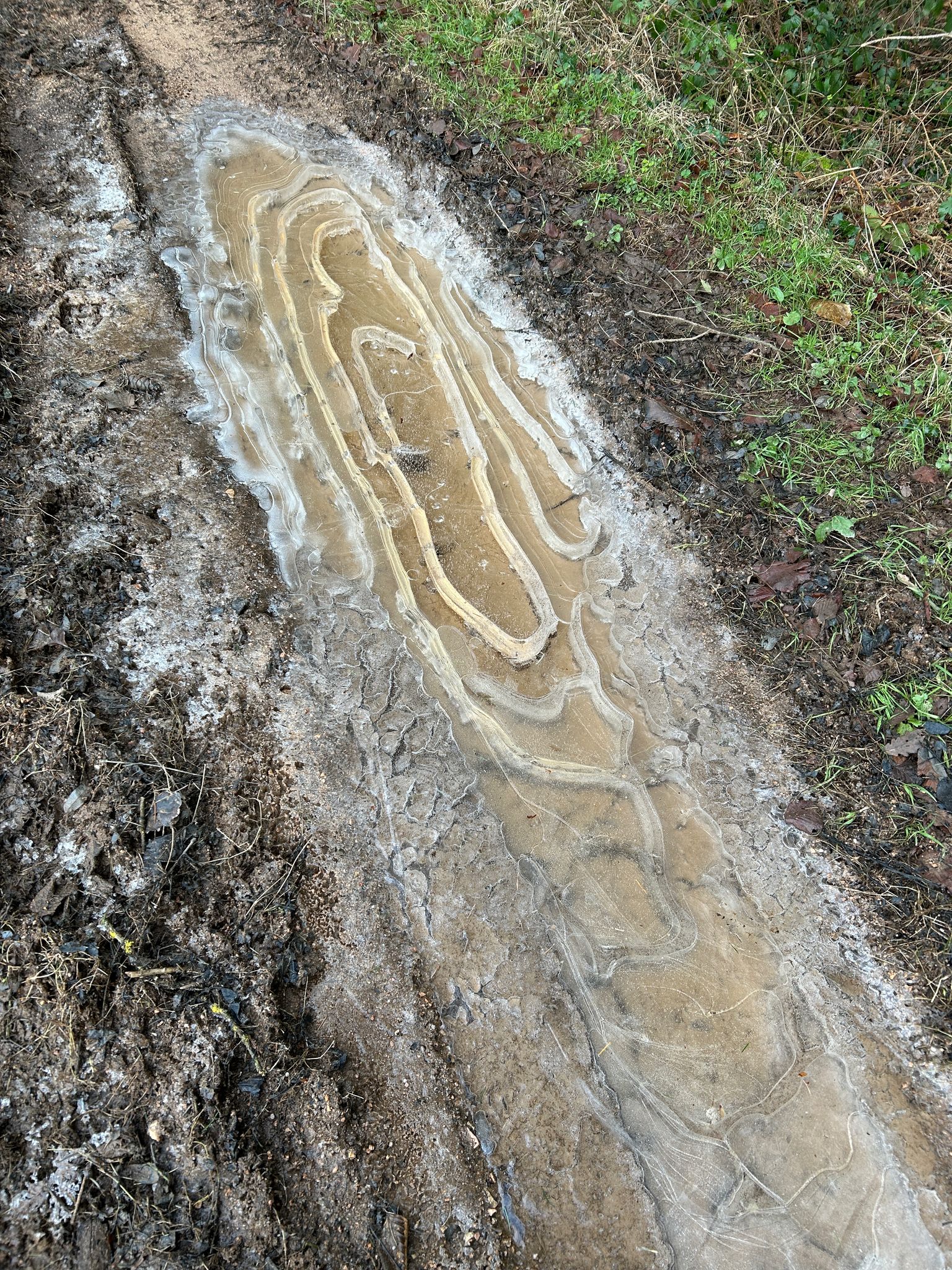 Tijd voor een frisse neus en lekker wandelen. De riviertjes blijven stromen. Nu zelfs met ijs aan de zijkant. Op veel plekken komt het water uit de grond omhoog, als het gaat vriezen zie je dat heel goed, zoals hieronder, net een kunstwerkje toch? De kinderen vinden het super leuk om over het ijs te lopen.