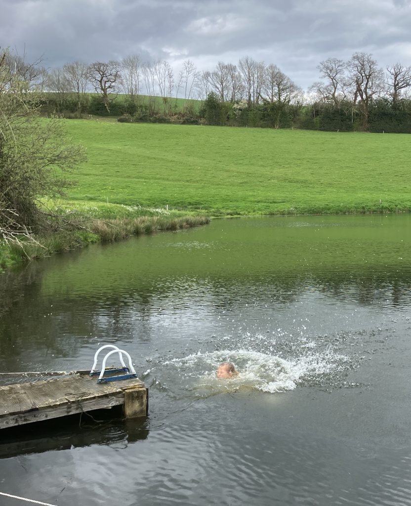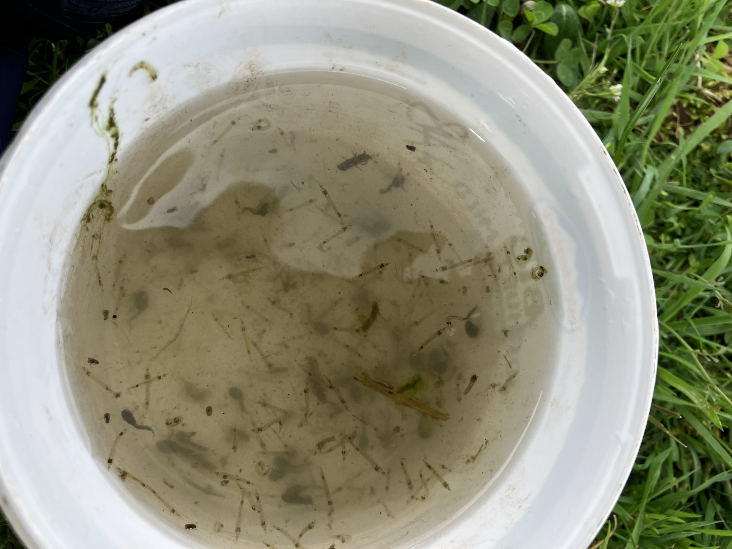 In het weekend werd het weer warm weer! We gingen toen zelfs met hele gezin en Lambert ging ook zwemmen. We gingen ook op de surfplank zitten en zo rondjes varen over het meer. We konden heel veel kikkervisjes zien zwemmen. Het zijn nog dikkopjes, want ze hebben nog geen pootjes. Je ziet ze ook in het emmertje.