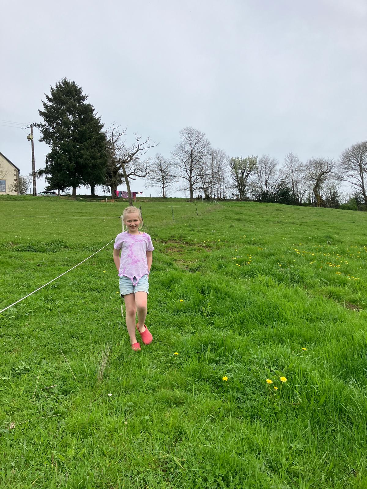 Hier ben ik onderweg naar het meertje. Ik heb leuke klompjes aan…. Ik ga nog een keer zwemmen vandaag.